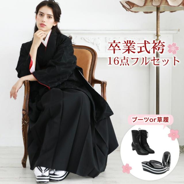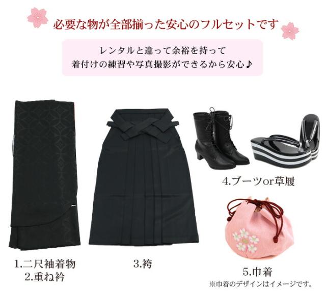 【販売】袴 セット 卒業式 女性 ブーツor草履16点フルセット 購入 販売 卒業式袴セット 2尺袖着物&袴「黒地に七宝柄」袴セット 二尺袖 女 ブーツ 草履 大学生 大学 上品 大人 レトロ モダン モノトーン