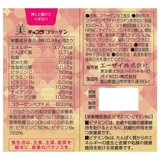 商品名 美チョコラコラーゲン 40日分 120粒 2セット エーザイ 【栄養機能食品】 容量 120粒 2セット:合計240粒 原材料名 コラーゲンペプチド(ゼラチンを含む)/結晶セルロース、V.C、ショ糖脂肪酸エステル、HPMC、ナイアシン、パントテン酸Ca、微粒酸化ケイ素、着色料(二酸化チタン)、V.B6、タルク、グリセリン、糊料(アラビアガム)、V.B2、V.B1、カルナウバロウ 生産国 日本 加工地 日本 賞味期限 商品の発送時点で、240日以上あるものをお届けいたします 保存方法 常温 1日の摂取目安量 1日3粒を目安に、かまずに水などでお召し上がりください。
