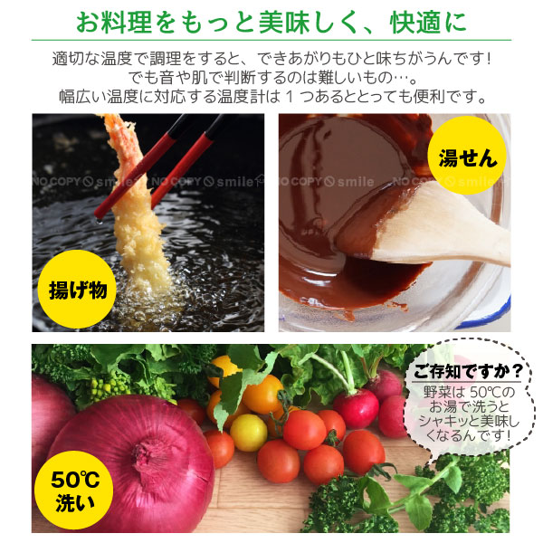 チョコの湯せんや揚物、50度洗いなどの検温に便利です。