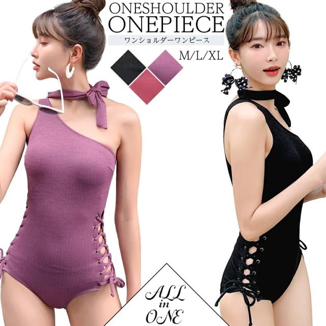 ワンピース オールインワン 水着 レディース 体型カバー ワンショル ワンショルダー レースアップ 韓国 韓国ファッション プチプラ セクシー アシメデザイン モテカワ水着 バックシャン プール 海 ビーチ リゾート 旅行 夏休み ナイトプール トップス ワンショルトップス 海水浴 海開き オトナ女子 大きいサイズ かわいい 女性 ママ水着 10代 20代 30代 40代 黒 ピンク パープル 2021新作