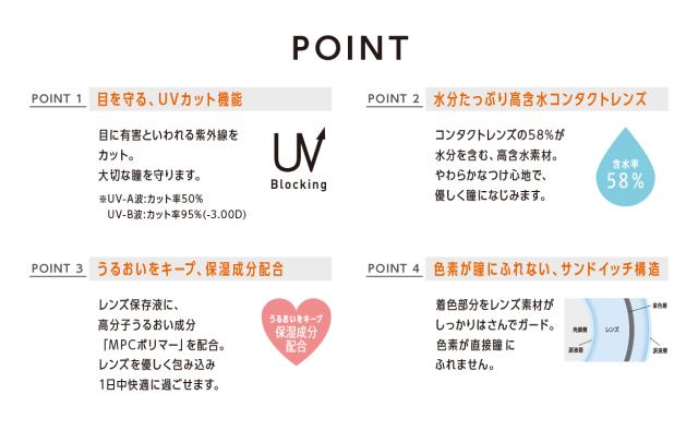 また、UVカット、サンドイッチ構造により着色部分が直接目に触れない、やわらかな付け心地の高含水素材など、瞳の為にこだわったコンタクトレンズになっています。