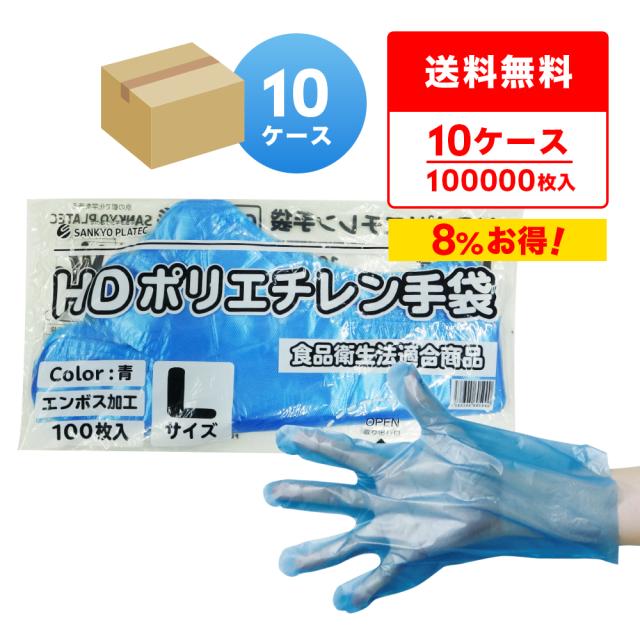 ポリエチレン手袋 HD Lサイズ 青 約25.5x28.5cm 100枚x100冊x10箱 HPGL-100B-10 片エンボス 衛生手袋 使い捨て ポリ手袋 食品衛生法適合 左右兼用 送料無料