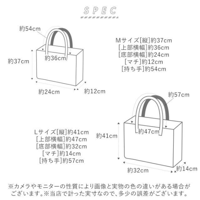 | サイズ | ・Mサイズ [縦]約37cm/[上部横幅]約36cm/[底部横幅]約24cm [マチ]約12cm/[持ち手]約54cm ・Lサイズ [縦]約41cm/[上部横幅]約47cm/[底部横幅]約32cm [マチ]約14cm/[持ち手]約57cm ※サイズは当店計測の実寸サイズです。実際の商品ならびにメーカー表記サイズとは多少の誤差が生じる場合がございます。あらかじめご了承ください。 |