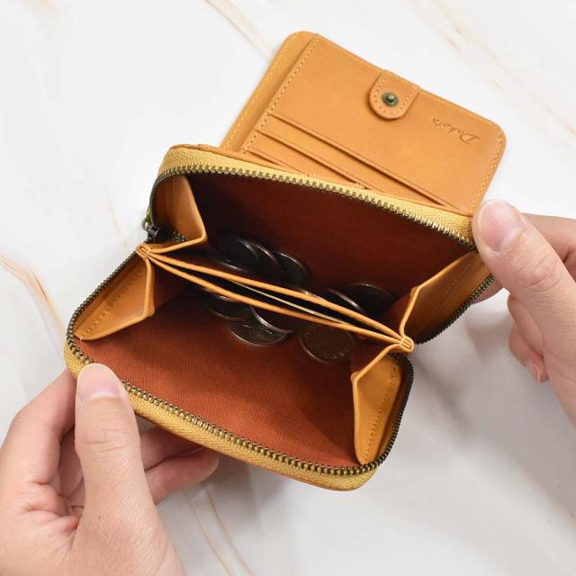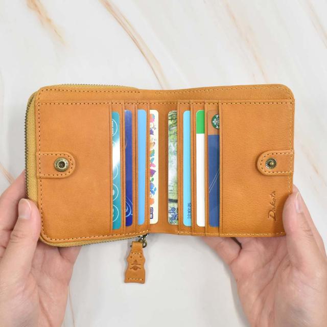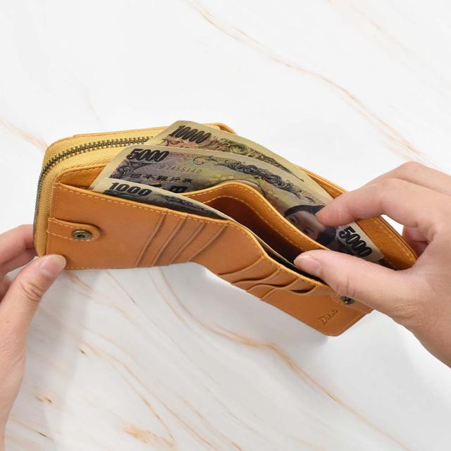 メイン収納部はボタンで開閉でき、カードポケット6つ、フリーポケット2つを装備。札入れは2つに分かれているため、紙幣の仕分けも可能です。また、ラウンドファスナーの小銭入れは外側に配置しているので、急いでいる時でもさっと取り出すことができます。シンプルな作りですが、しっかりとした収納力を持っています。