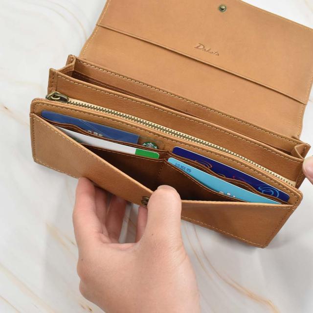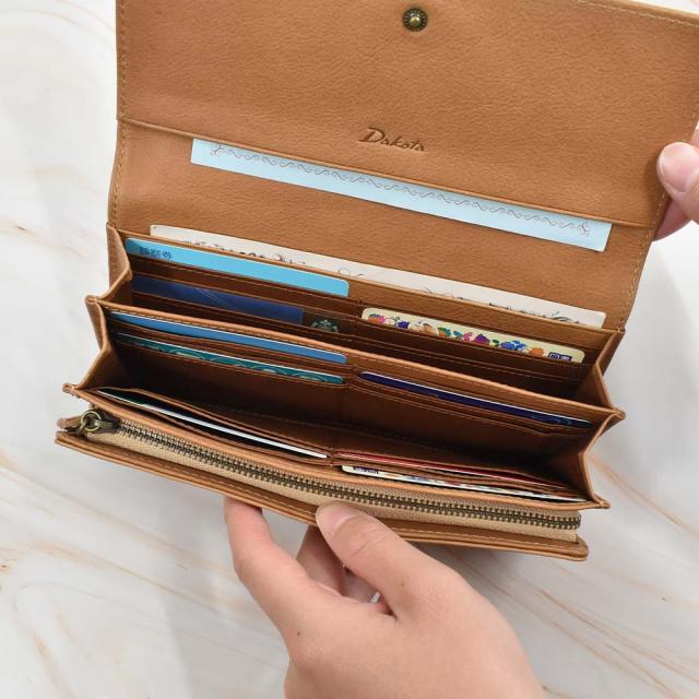 カードが2つの札入れスペース内に18枚、手前のポケットに4枚の計22枚収納できる大容量の長財布。札入れも2か所に分かれているほか、フリーポケットを内側・外側に設けており、領収書やレシートの収納にも便利です。