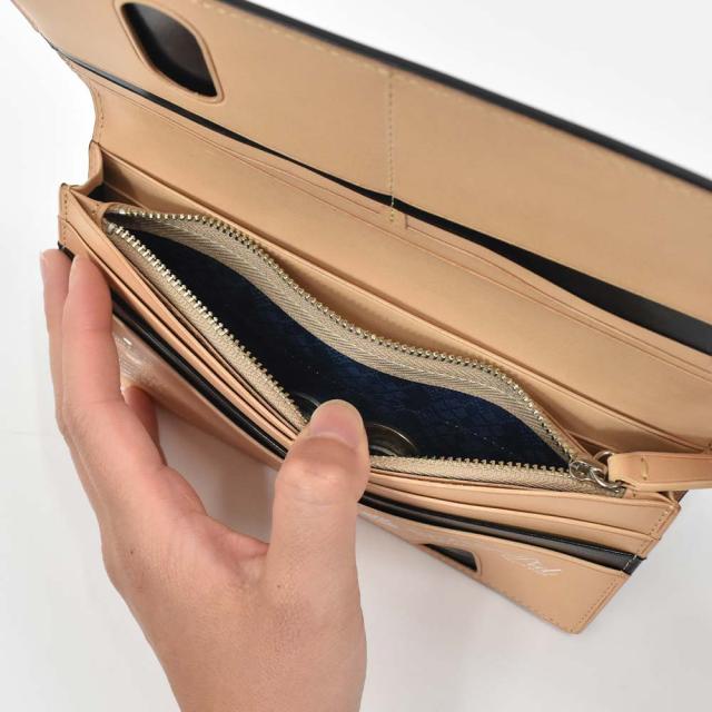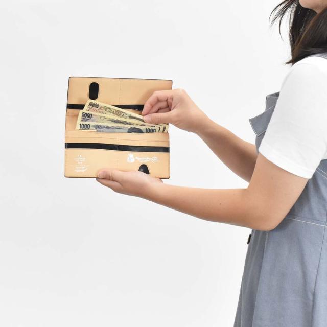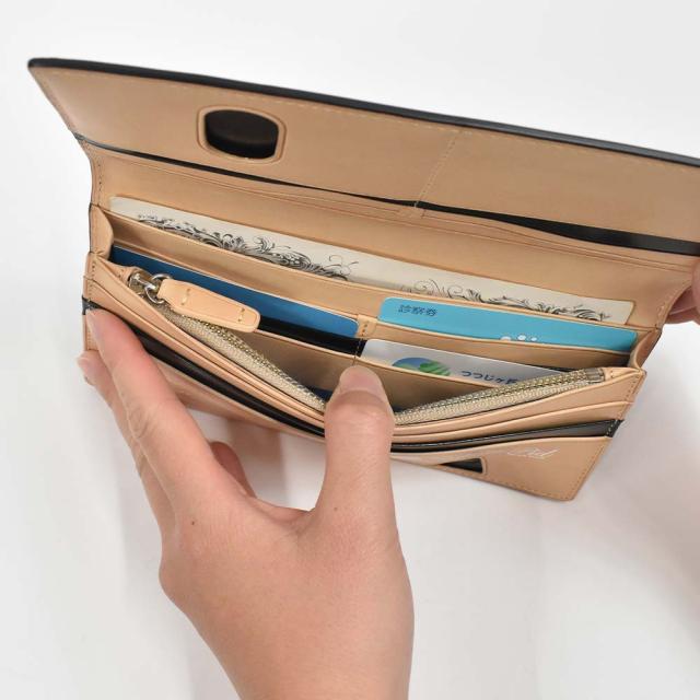 薄マチのデザインですが、カードポケット×18、大ポケット×3、札入れ、小銭入れと豊富な収納力を持っています。ラウンドファスナー型の長財布と比べるとスマートな作りなので、ジャケットのポケットなどに入れてもかさばりにくいアイテムです。