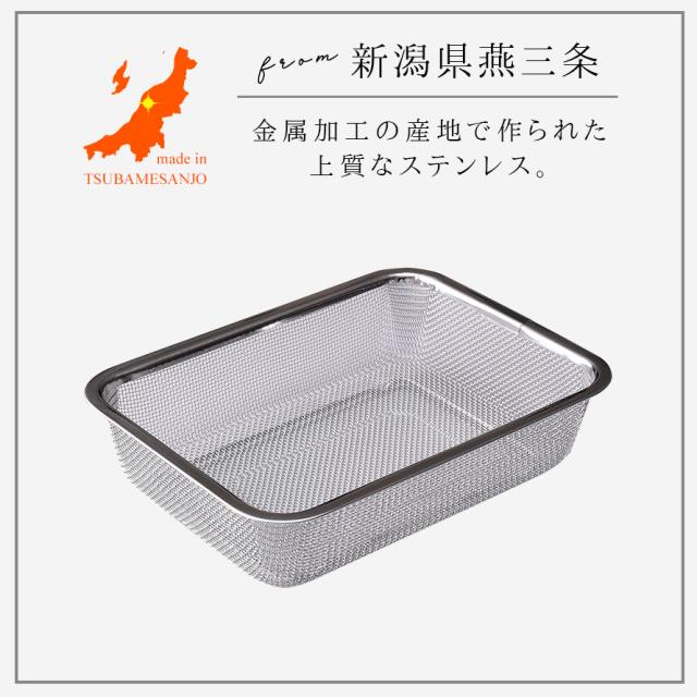 燕三条,ステンレス,ざる,ザル,網,脚付き,四角,角型,スクエア,水切り,湯切り,日本製,高級,高級感,調理器具,調理道具,キッチンツール,キッチン,台所,調理,料理,家事,キッチン用品,キッチン雑貨,台所用品,キッチンアイテム,キッチングッズ,時短,アイデア,便利グッズ,おすすめ,オススメ,人気,清潔,衛生的,汚れが落ちやすい,洗いやすい,乾きやすい,錆びにくい,サビにくい,丈夫,上質,高品質