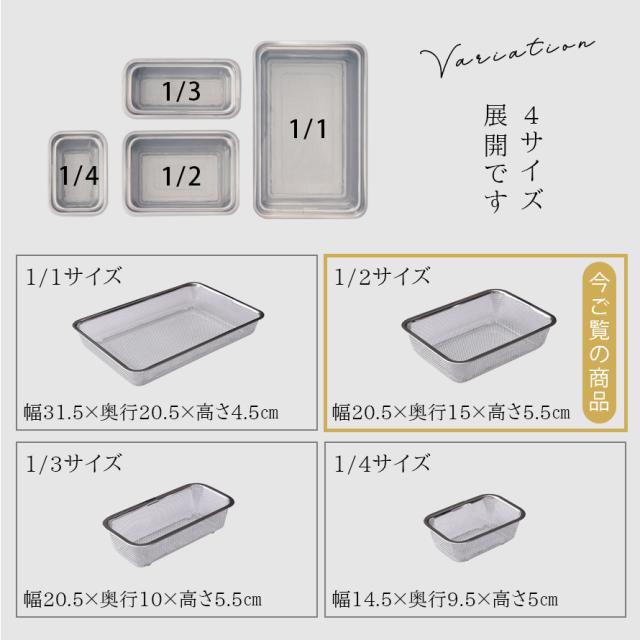 レタスやカット野菜などの水切りに、ちょうど良い大きさとちょうど良い深さがこの1/2サイズ。