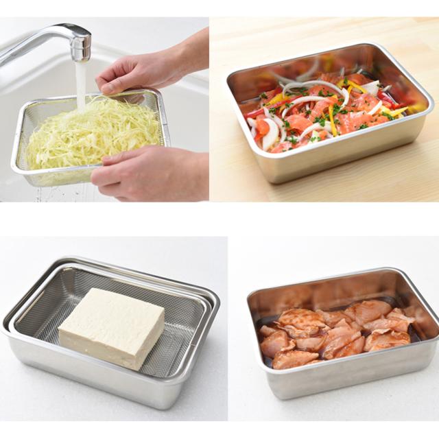 燕三条,ステンレス,バット,ステンレスバット,保存容器,セット,フードコンテナ,ストッカー,冷蔵庫,保存,容器,入れ物,四角,角型,スクエア,揚げ物,フタ付き,蓋付き,ふた付き,フタ,蓋,ふた,すっきり,重ねられる,スタッキング,ざる,ザル,網,脚付き,水切り,湯切り,日本製,高級,高級感,調理器具,調理道具,キッチンツール,キッチン,台所,調理,料理,家事,キッチン用品,キッチン雑貨,台所用品,キッチンアイテム,キッチングッズ,時短,アイデア,便利グッズ,おすすめ,オススメ,人気,清潔,衛生的,汚れが落ちやすい,洗いやすい,乾きやすい,錆びにくい,サビにくい,丈夫,上質,高品質