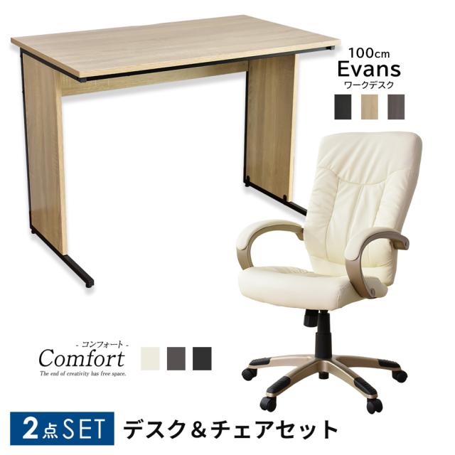 パソコンデスク オフィスチェア セット 在宅勤務 テレワーク オフィスデスク PCデスク ハイバック 高さ調整 ガス圧 ロッキング 肘付 エバンス100 コンフォート
