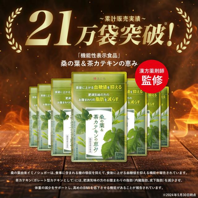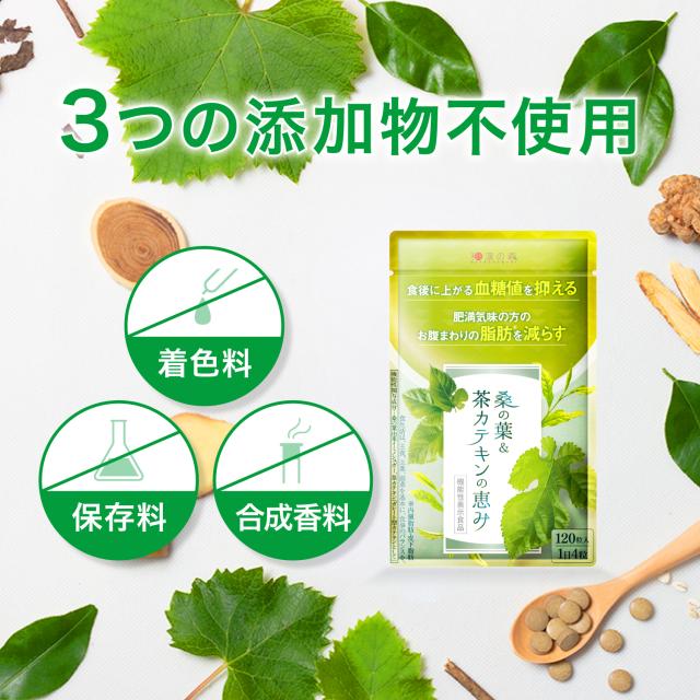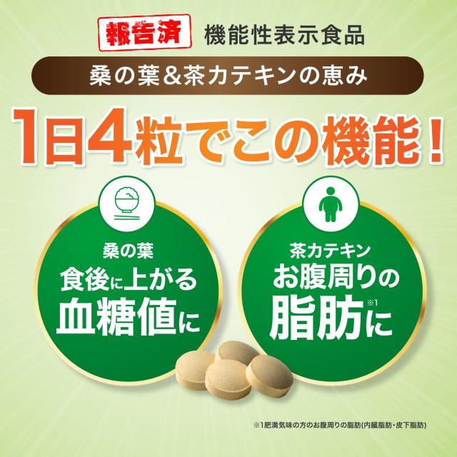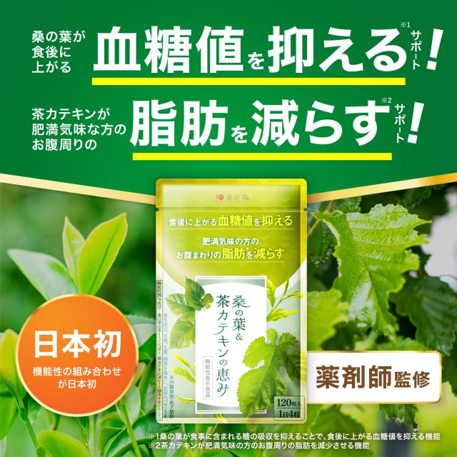 "『 桑の葉 & 茶カテキン の恵み』は、お腹の脂肪を減らす機能がある《 茶カテキン 由来の ガレード型 カテキン》を主成分(機能性関与成分)とした ダイエット サプリメント です。"名称:桑の葉&茶カテキンの恵み