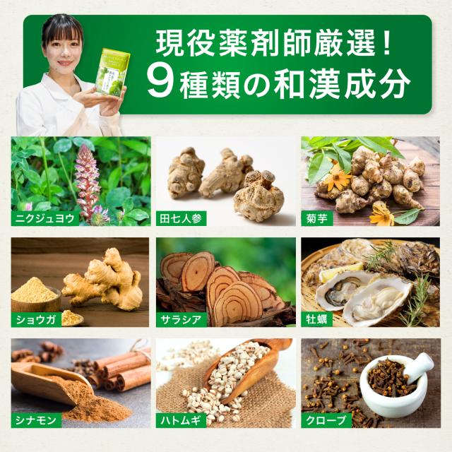 原材料:桑葉エキス末 でんぷん 還元パラチノース 有機田七人参粉末 クローブ ニクジュヨウ ケイヒ ハトムギ 牡蠣 菊芋 サラシア ショウガ 緑茶