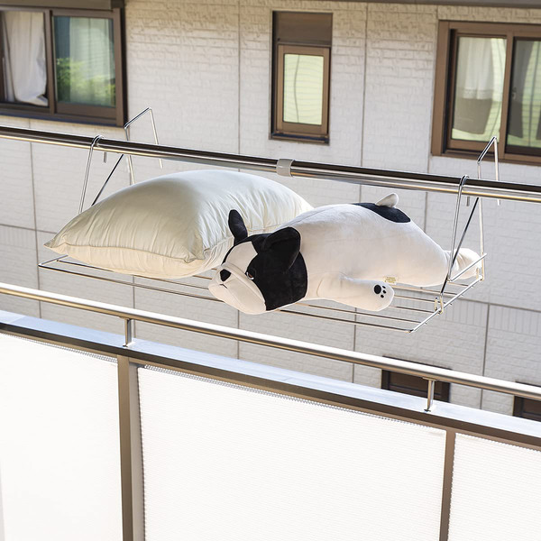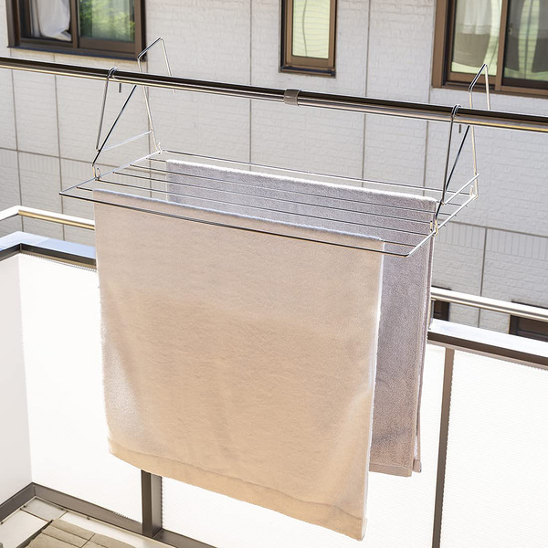 ベランダの手すりに掛けて干せます。物干し竿がない場所や、物干し竿がいっぱいで掛けられないときに便利です。スタンドタイプと違って足元スッキリ。足を引っ掛けて転倒させる心配もありません。