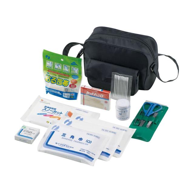 ●品番:MY-4740 ,規格:セット ,詳細サイズ:《バッグ寸法》W220×D90×H150mm ,構成品:三角巾・大(1枚)、ガーゼ30cm×1m(2枚)、脱脂綿8×16cm・10g(1コ)、サージカルテープ12mm(1コ)、伸縮包帯(1コ)、貼る包帯・大(1コ)、絆創膏10枚入(1箱)、毛抜き、ハサミ、ピンセット、救急バッグ