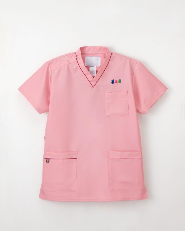 ●miffyの絵本に使用されているうさぎのモチーフを胸元に刺繍し、衿元、ポケット口に配色のコードパイピングを挟み込みました。大人っぽい配色で、いままでにない雰囲気のスクラブになっています。ポケット口に挟み込んだブルーの織ネームもポイントになっています。