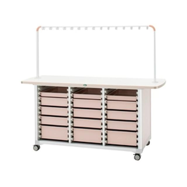 ●品番:WT-1506B-2 ,カラー:《本体》ピーチ《トレー》ブルー ,製品サイズ:W1500×D700×H1569(台高869)mm ,詳細サイズ:《トレー内寸》PT64-05=W348×D548×H47mm(3コ)、PT64-10=W348×D548×H97mm(9コ)、PT64-17=W347×D547×H157mm(3コ) ,材質:本体フレーム=アルミニウム、天板=メラミン化粧板、トレー(ピーチ・ブルー・ニュートラル)=ABS(持続性帯電防止樹脂)、トレー(透明)=ポリカーボネート ,キャスター(サイズ・双輪・ストッパー付):φ75mm