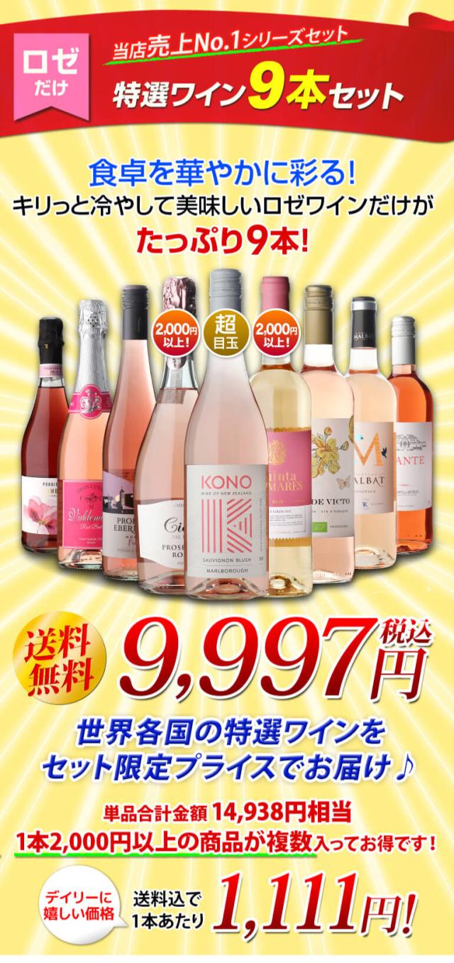 1本あたり1,111円(税込) 送料無料 ロゼだけ特選ワイン9本 23弾 ワインセット ワイン バラエティセット 金賞 飲み比べ 浜運 御歳暮 お歳暮