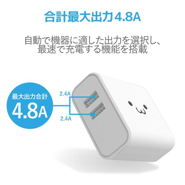 ■スマートフォンやタブレットを付属もしくは対応する充電用USBケーブルを使用して、各ポート最大12W(5V/2.4A)、合計最大24W(5V/4.8A)出力で充電できるAC充電器です。