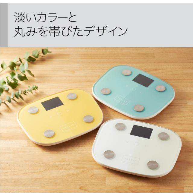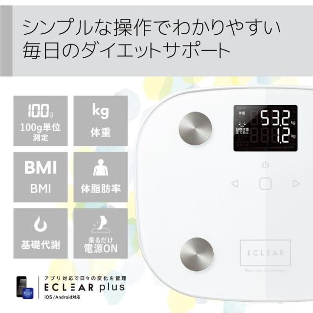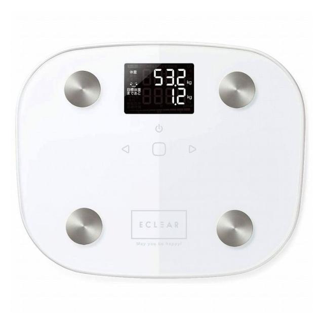 目標体重設定機能と顔文字表示で毎日の変化が見える“ECLEAR 体組成計”です。MRI測定データに基づき体組成データを算出する体積推定方式を筑波大学と共同で開発。 目標体重設定機能搭載で測定後に目標との差を表示。顔文字表現により体重の増減がひと目で分かります。体重は100グラム単位で測定が可能。体重・BMI・体脂肪率・基礎代謝の4項目が測定可能です。