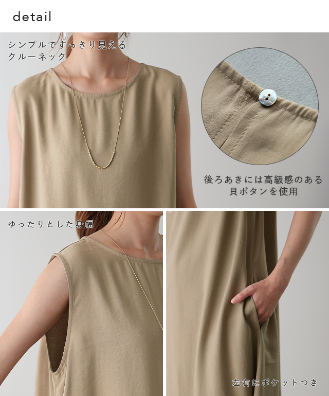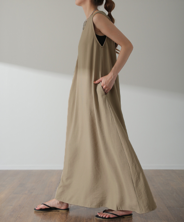 シンプルなのに着映えるテントラインノースリワンピース。