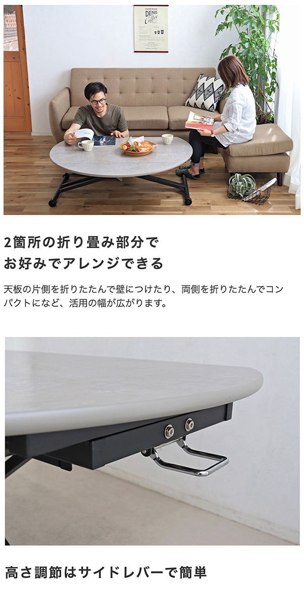 天板は変形式で丸形のラウンドテーブル(直径120cm)から一方を折り込むことで変形丸形タイプまた両方を折り込むことでセンターテーブルにもなる優れモノ。