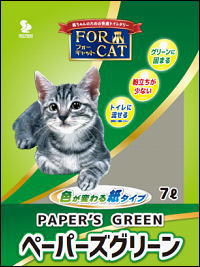 尿を含むと固まった部分が緑色に変化するので、処理が簡単です。また、再生パルプとポリマーの使用によりニオイの吸着効果を高めた環境にも優しい燃やせる紙砂です。