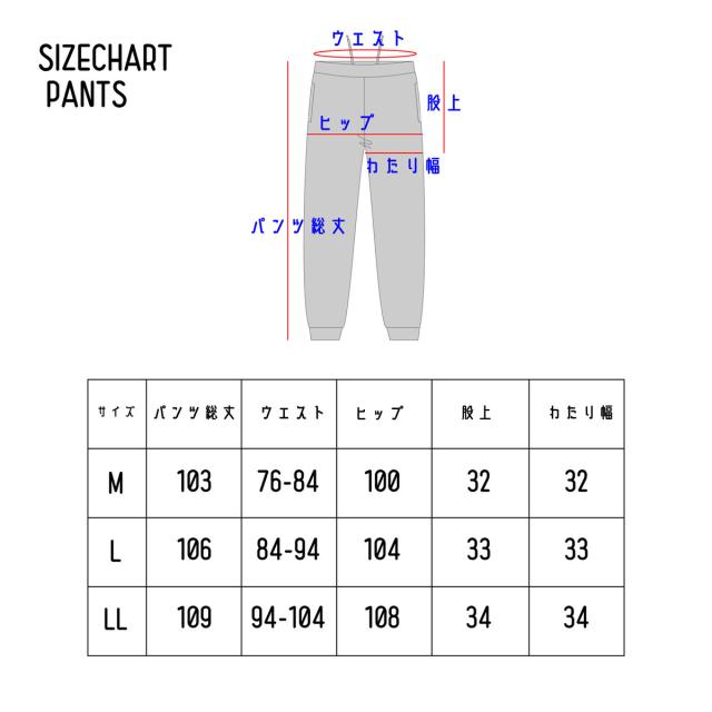 Mサイズ 総丈 約103cm ウエスト 約76-84cm ヒップ 約100cm わたり幅 約32cm 股上 約32cm Lサイズ 総丈 約106cm ウエスト 約84-94cm ヒップ 約104cm わたり幅 約33cm 股上 約33cm LLサイズ 総丈 約109cm ウエスト 約94-104cm ヒップ 約108cm わたり幅 約34cm 股上 約34cm |