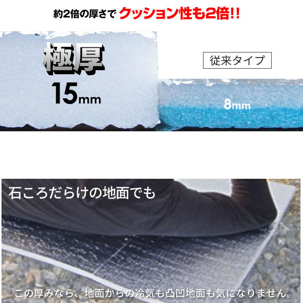 厚さ15mmの極厚クッションと表面のアルミフィルムで、地面の冷気や湿気もシャットアウト。