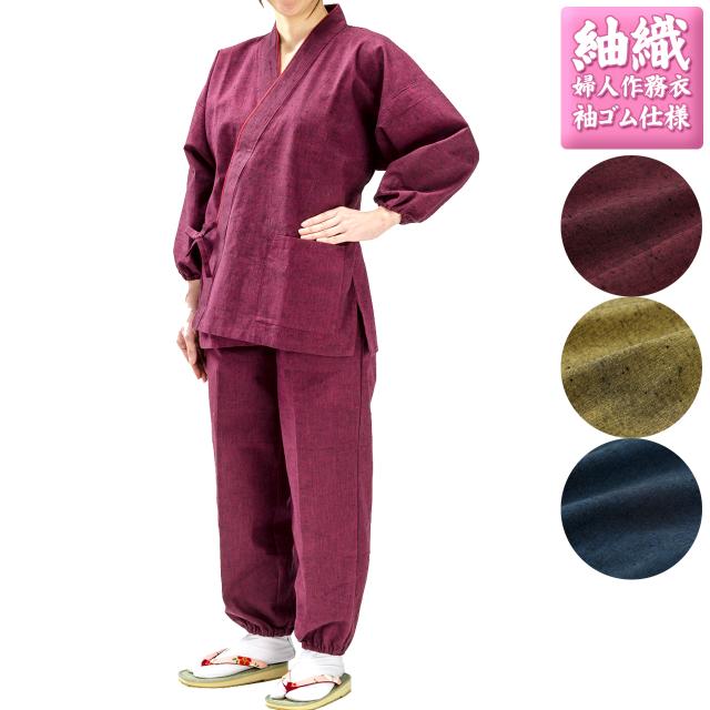 作務衣 紬織 女性 婦人 レディース お名前 春 夏 秋 3シーズン対応 敬老の日 お誕生日 プレゼント 制服に最適です、袖ゴム仕様がとても便利