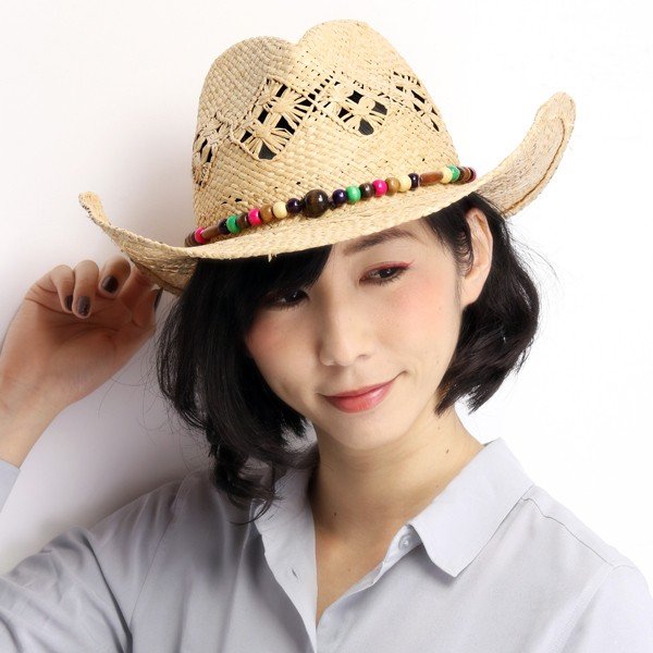 ストローハット レディース カウボーイ 春夏 ラフィアハット 麦わら帽子 メンズ テンガロン ビーズアクセサリー 天然草 帽子 アウトドア バカンス リゾートコーデ 紐 サイズ調整可 生成 UVカット帽子