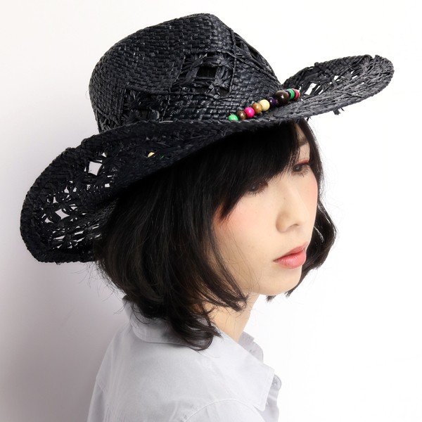 ラフィアハット レディース ストローハット カウボーイ 春夏 麦わら帽子 メンズ テンガロン ビーズアクセサリー 天然草 帽子 アウトドア アジアンコーデ リゾートファッション 紐 サイズ調整可 黒 ブラック UVカット帽子