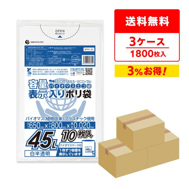 【まとめて3ケース】BPKC-43-3 バイマスプラスチック使用容量表示ポリ袋 45リットル 0.020mm厚 白半透明 10枚x60冊x3箱 / ゴミ袋 ごみ袋 送料無料