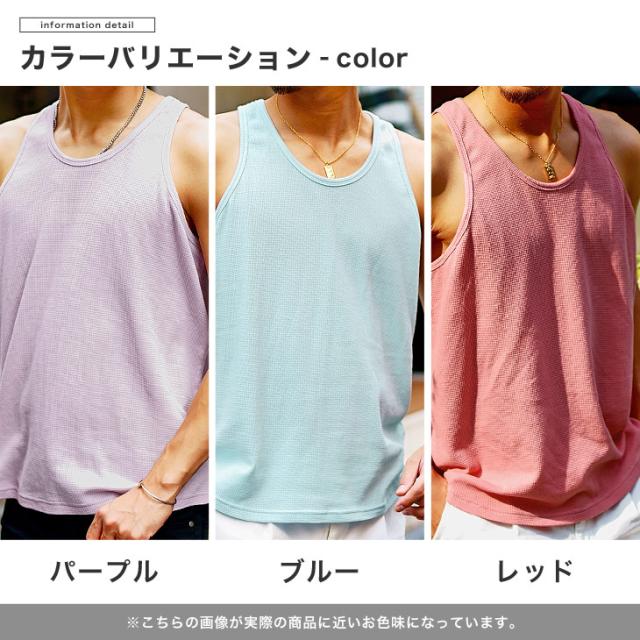 『ワッフルタンクトップ』嬉しい多色展開のタンクトップ。【男のレベルの見せどころ】トレンド性、ファッション性、女性はとなりを歩けるか?という観点から男を見ている。無駄のないシンプルなデザインを採用することで、一枚でもインナーとしてもサマになるひと品。また、ベーシックなホワイト、ブラックの他にも、グリーンやパープル、ブルー、レッドといったトレンドのペールトーンのカラーバリエーションでファッション性もプラス。生地は柔らかい肌触りがやみつきになるワッフル生地を採用し、抜群の穿き心地を実現。トレンド性、ファッション性、目の肥えた女性も納得するひと品で、あの人のとなりへ。