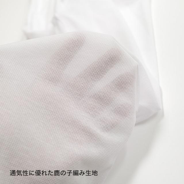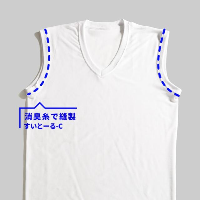生地全体に、抗菌防臭加工をほどこしています。また、袖と本体は、消臭糸「すいとーる-C」で縫製。脇のニオイをおさえられ、清潔感をたもてます。