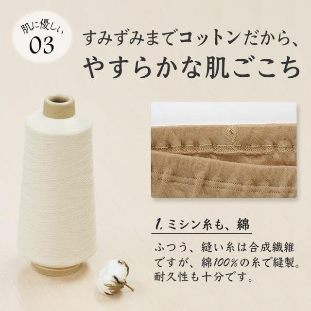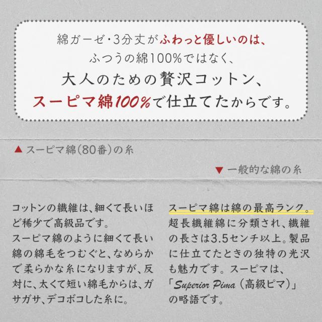ふわっと、やさしい肌ざわりがたまらない綿100%にこだわって作った3分丈ボトムです。ふわふわの柔らかさ、締め付けない着ごこち、軽さ、あたたかさ、保湿力、通気性。大人のための贅沢コットン・スーピマ綿を使って、日本の自社工場で仕立てました。日中はもちろん、おやすみの時もおすすめです。