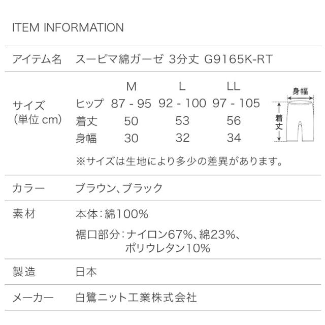 綿ガーゼ インナー 3分丈 シンプル レディース 年間 スーピマコットン 綿 100 % 敏感肌 こっくりカラー おしゃれ 締め付けない あったか 冷えとり 高級 G9165K-RT