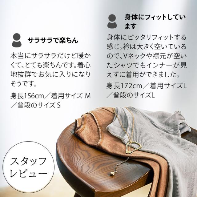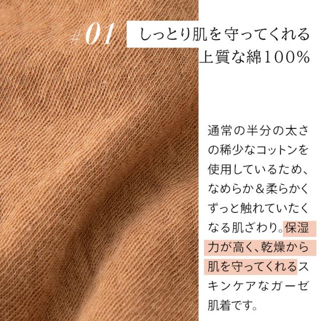 大人の肌に寄り添うHAKUROコットンガーゼの10分袖。肌が乾燥しやすくなった乾燥肌や、肌が刺激に弱くなった敏感肌さんにおすすめです。インナーは綿100を選ぶコットン派の女性にも大正解。自分に合うインナーをお探し中の方もぜひ試してみて! ガーゼ生地はほんのりあたたかいので、春秋冬がおすすめです。