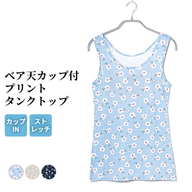ブラカップ付き プリント タンクトップ レディース 春夏 インナー 部屋着 ルームウェア ベア天竺 女性 肌着 婦人 L5541E-R