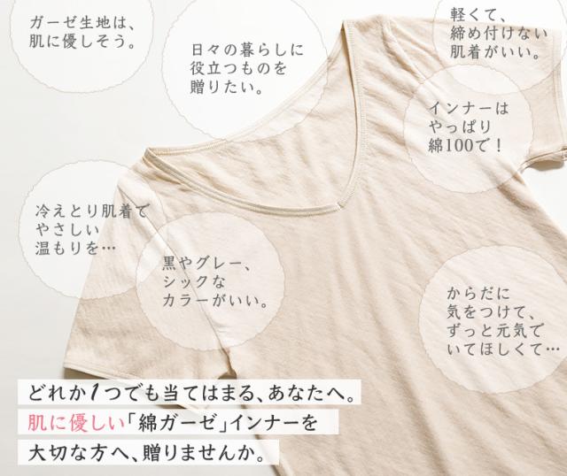 ギフト商品として、綿ガーゼ(レース無しシンプルシリーズ)のタンクトップ、フレンチ袖、8分袖、5分丈を4枚セットにしました。ふわっと、やさしい肌ざわりがたまらない綿100%にこだわってつくったインナーです。ふわふわの柔らかさ、締め付けない着ごこち、軽さ、あたたかさ、保湿力、通気性。大人のための贅沢コットン・スーピマ綿を使って、日本の自社工場で仕立てています。日中はもちろん、おやすみの時もおすすめです。写真のダークブラウンのギフトボックスに入れて、オフホワイトのリボンで結んでお届けします。カードは、花とクマからお好きなほうを。個別メッセージご希望の場合は70字程度までお入れできます。備考欄にご記入ください。