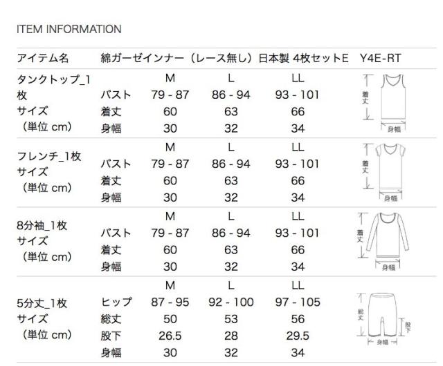 | アイテム名 | 綿ガーゼインナー(レース無し)日本製 4枚セットE Y4E-RT | ||||