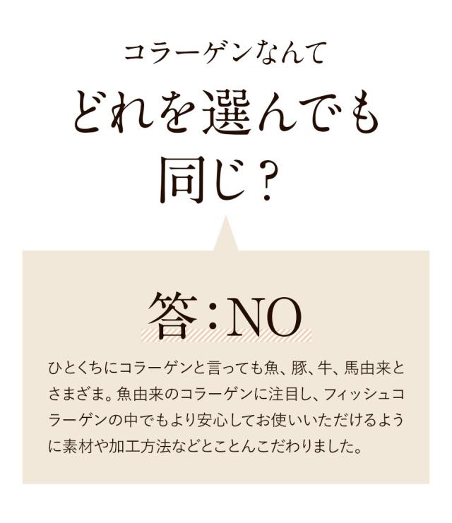 - 早めの発送有難うございました。コラーゲンはフィッシュの方がいいと聞いたので!どれも一緒かなとも思ったけれど気になったので購入してみました。こういうものは続けないと解らないし実感を感じるのはいつぐらいなんだろうか? まずは飲みやすいかと言うこととアレンジしやすいかって事。期待を込めまして★4つ