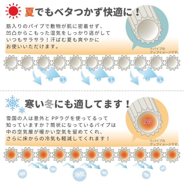 PP素材は水洗いできるので夏に海水浴などの休憩所等でもたびたび見かけますが、実は寒い東北ではビニール管内の空気層の保温効果を利用してあたたかく過ごすために冬に敷き詰めて使う家庭もあるそうです。