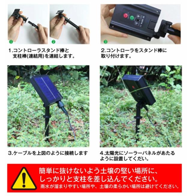 商品内容:ソーラーライトコントローラ×1個/赤外線リモコン×1個/LEDライトケーブル×1本/コントローラスタンド棒×1本/支柱棒(連結用)×1本/ウェブマニュアル案内用紙×1枚