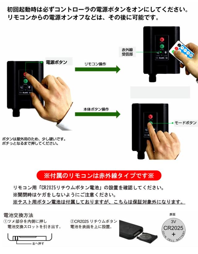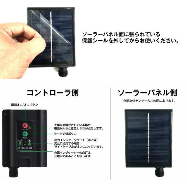 | 夜間のみライト点灯しますので、ご注意ください。 本商品のコントローラには、夜間点灯センサーが搭載されています。 電気のついた室内や、日中の屋外では電源を入れても点灯しません。 屋外または、室内の電気の消えた場所で、点灯をお試しください。夜間点灯センサーは、ソーラーパネル面にあります。 電源を入れ、ソーラーパネル面を机などの平らな面でソーラー面を下にして置くことで、ライトの点灯確認が可能です。 ※点灯しないとのお問い合わせのほとんどが、こちらの内容になります。 |