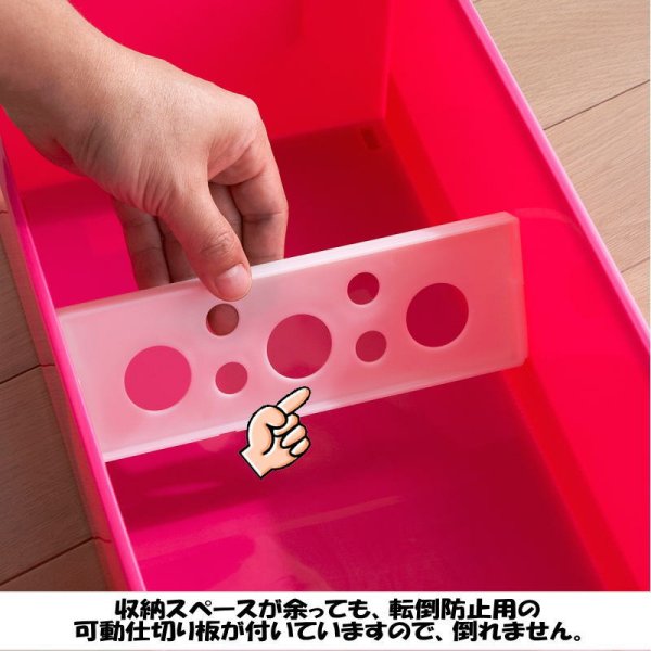可動仕切り板が1枚付きで収納スペースを余した状態でもコミック本やビデオテープが倒れません。
