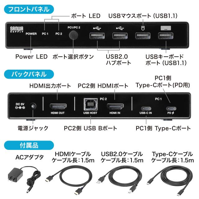 ●1組のHDMIディスプレイ・USBキーボード・USBマウスと、USB機器2台を、2台のパソコンで切り替えて使用できます。●PC1側のUSB Type-CポートはUSB PD給電にも対応。ACアダプタを接続することでパソコンを充電しながら使用できます。