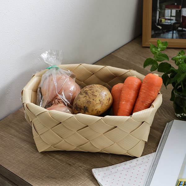 食品検査適合済みで、食品に悪影響を及ぼす有害物質は含まれていないことが証明されているので、野菜やパンなど口にするものを、直接かごに入れられます。キッチンクロスなどを組み合わせると、お洒落に演出できます。