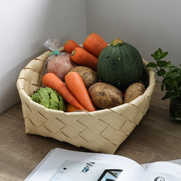食品検査適合済みで、食品に悪影響を及ぼす有害物質は含まれていないことが証明されているので、野菜やパンなど口にするものを、直接かごに入れられます。キッチンクロスなどを組み合わせると、お洒落に演出できます。