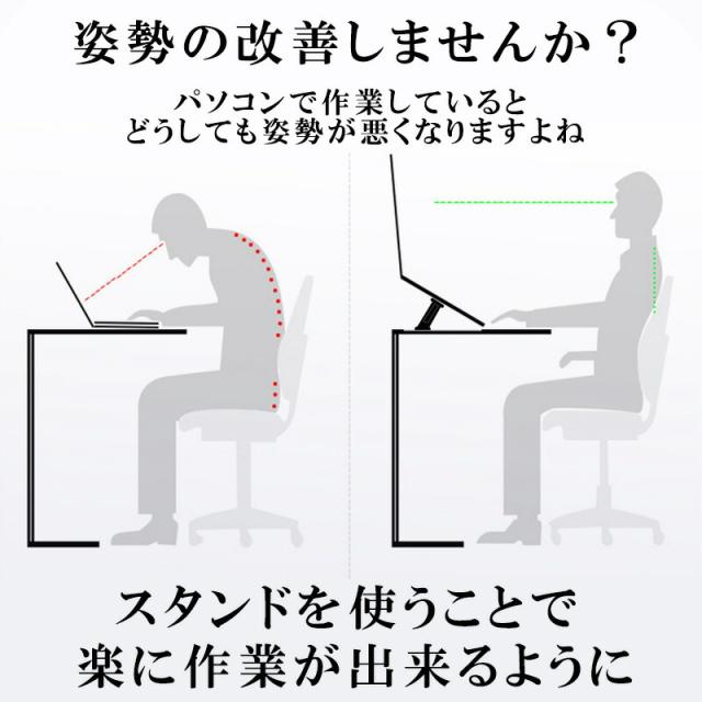 | 使用状況により高さや角度を調整できます。6段階調整で高さ調節が可能で、自分に一番適合な高度に調整できます。 PC作業時の姿勢を改善して、自然な状態でパソコンが使えるので、長時間作業しても快適です。モニターを見る視線が上がり、肩や腰の負担軽減が期待できます。 安定性抜群、2Kgの物を乗せても安定します。滑り止めやストッパーがついているのでノートPCを斜めにしても状態を維持できます。 強化プラスチック素材から全体的な構造まで、細部に至るまで精巧に作られるPCスタンドです。 |