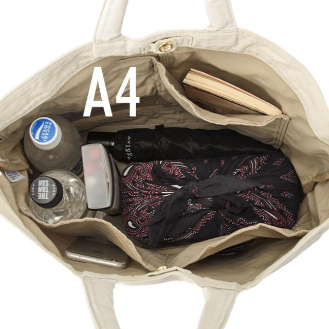 メイン収納は大容量・A4サイズ収納可能です。ペットボトルや折りたたみ傘も収納可能。